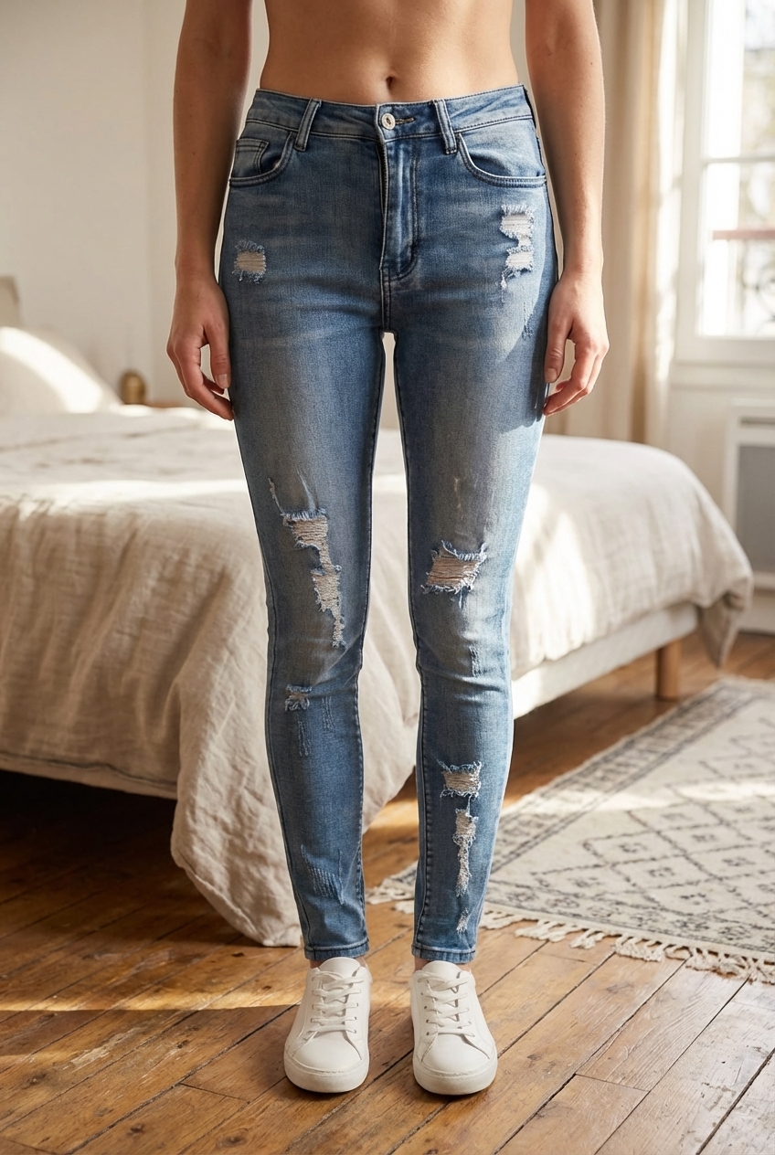 Jeans troué femme taille 36 debout, face à la caméra, dans une chambre à la lumière douce, avec une lumière naturelle filtrant par la fenêtre.