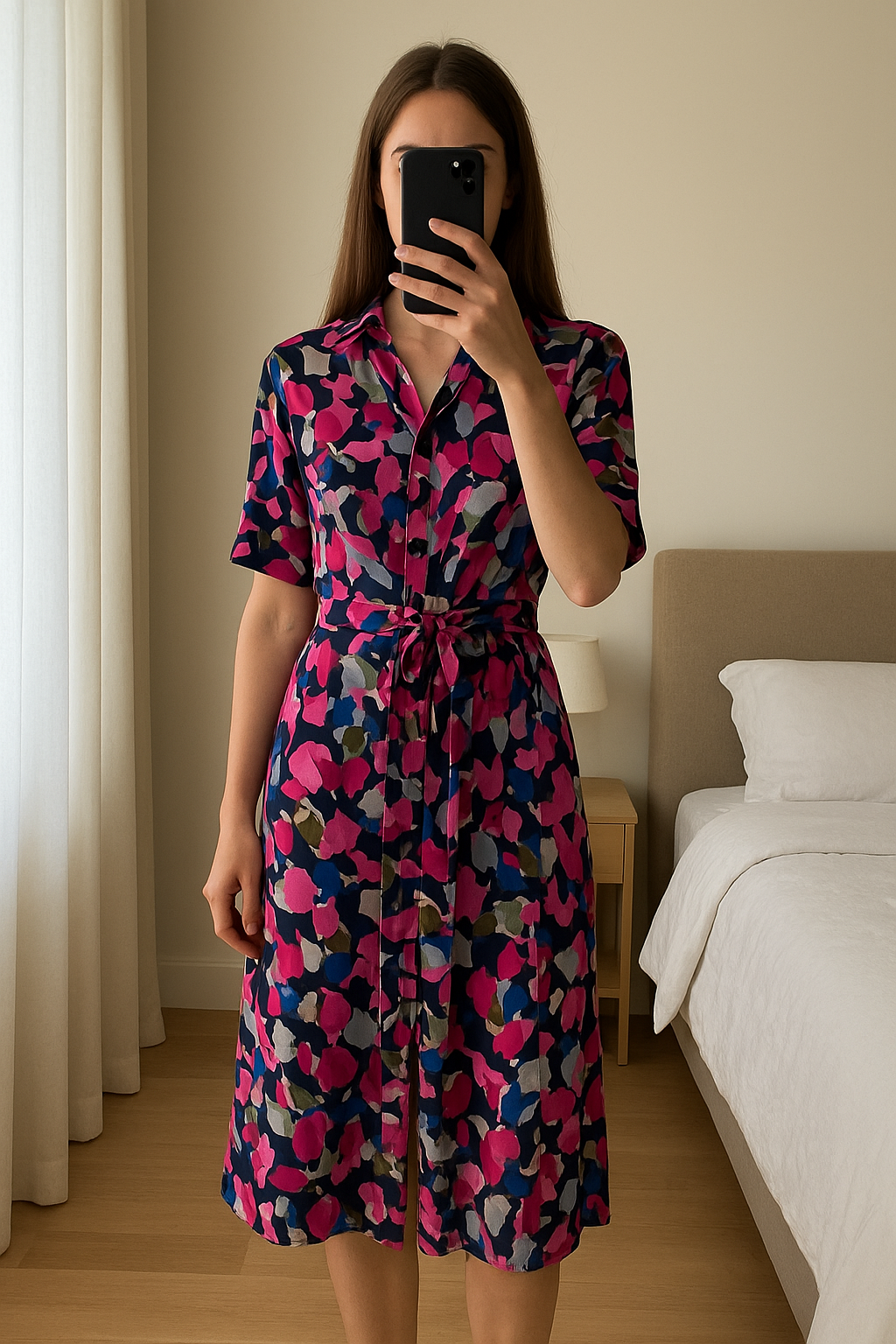 Jigsaw Women’s Playsuit standing straight facing the camera, in a softly lit bedroom setting, with gentle natural light filtering through a window.