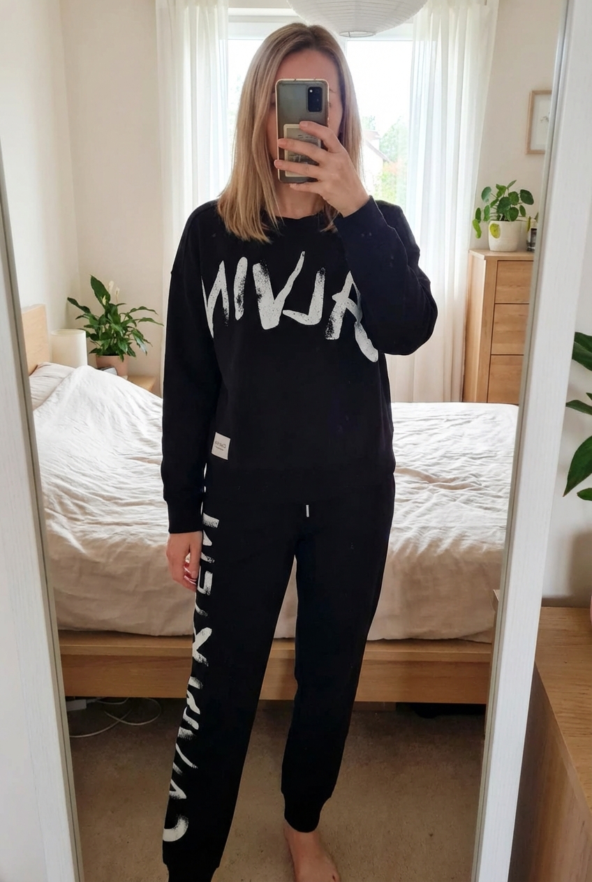 Une personne en Jogging fin - femme - S - Calvin Klein debout, face à la caméra, dans une chambre à la lumière douce, avec une lumière naturelle filtrant par la fenêtre.
