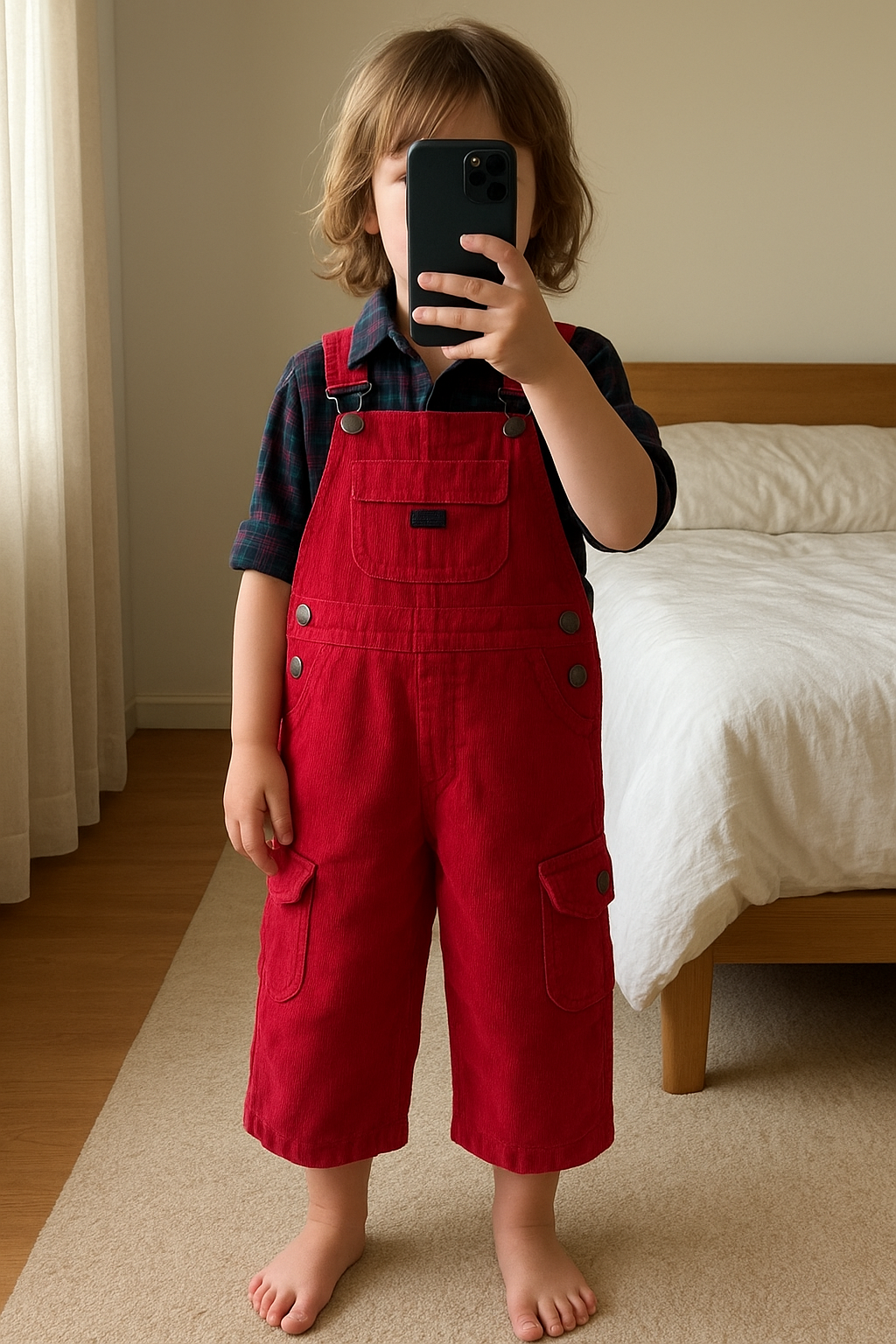 Jojo Maman Bebe Red Corduroy Dungarees 3-6 months standing straight facing the camera, in a softly lit bedroom setting, with gentle natural light filtering through a window.