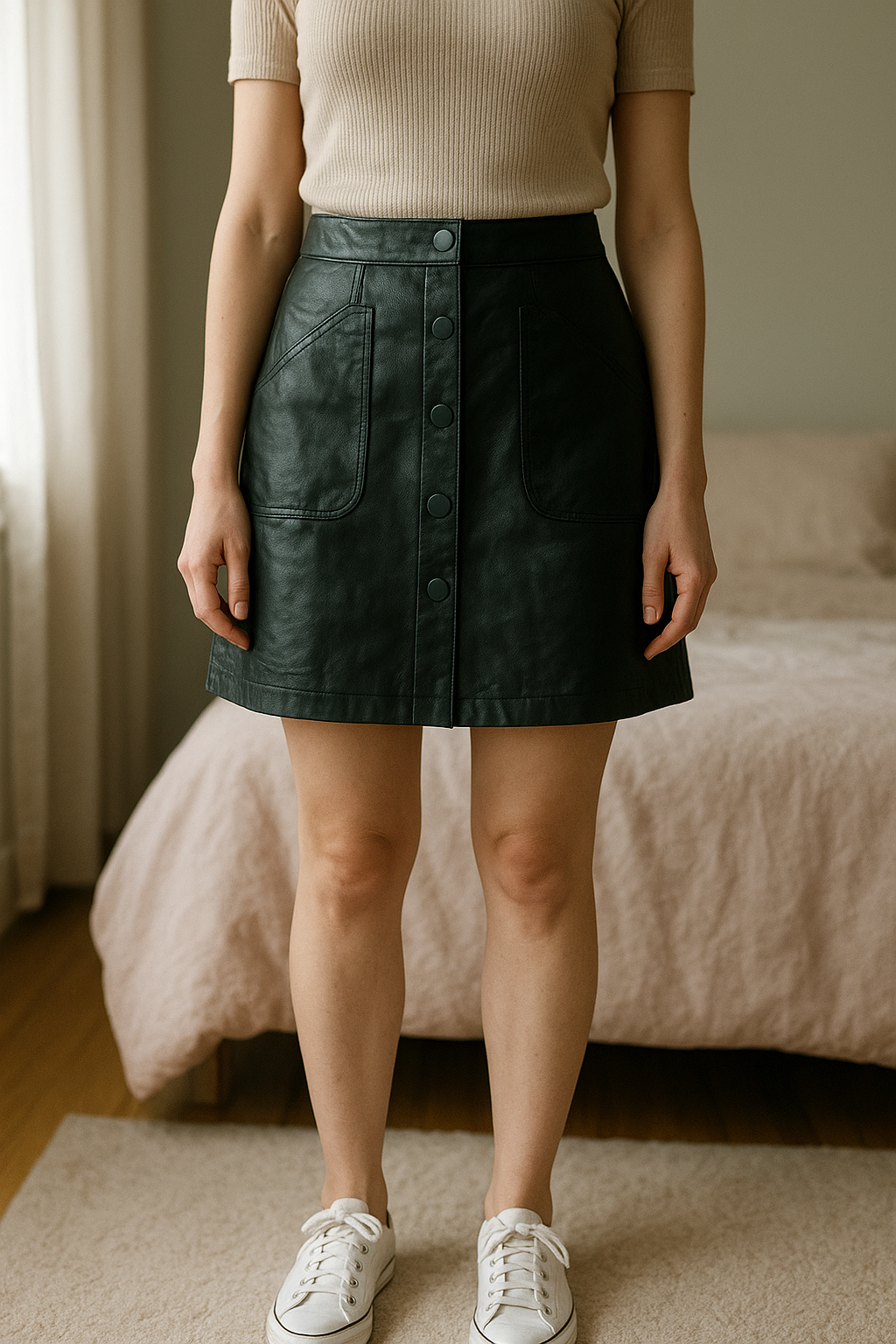 Jolie jupe en similicuir avec bouton debout, face à la caméra, dans une chambre à la lumière douce, avec une lumière naturelle filtrant par la fenêtre.