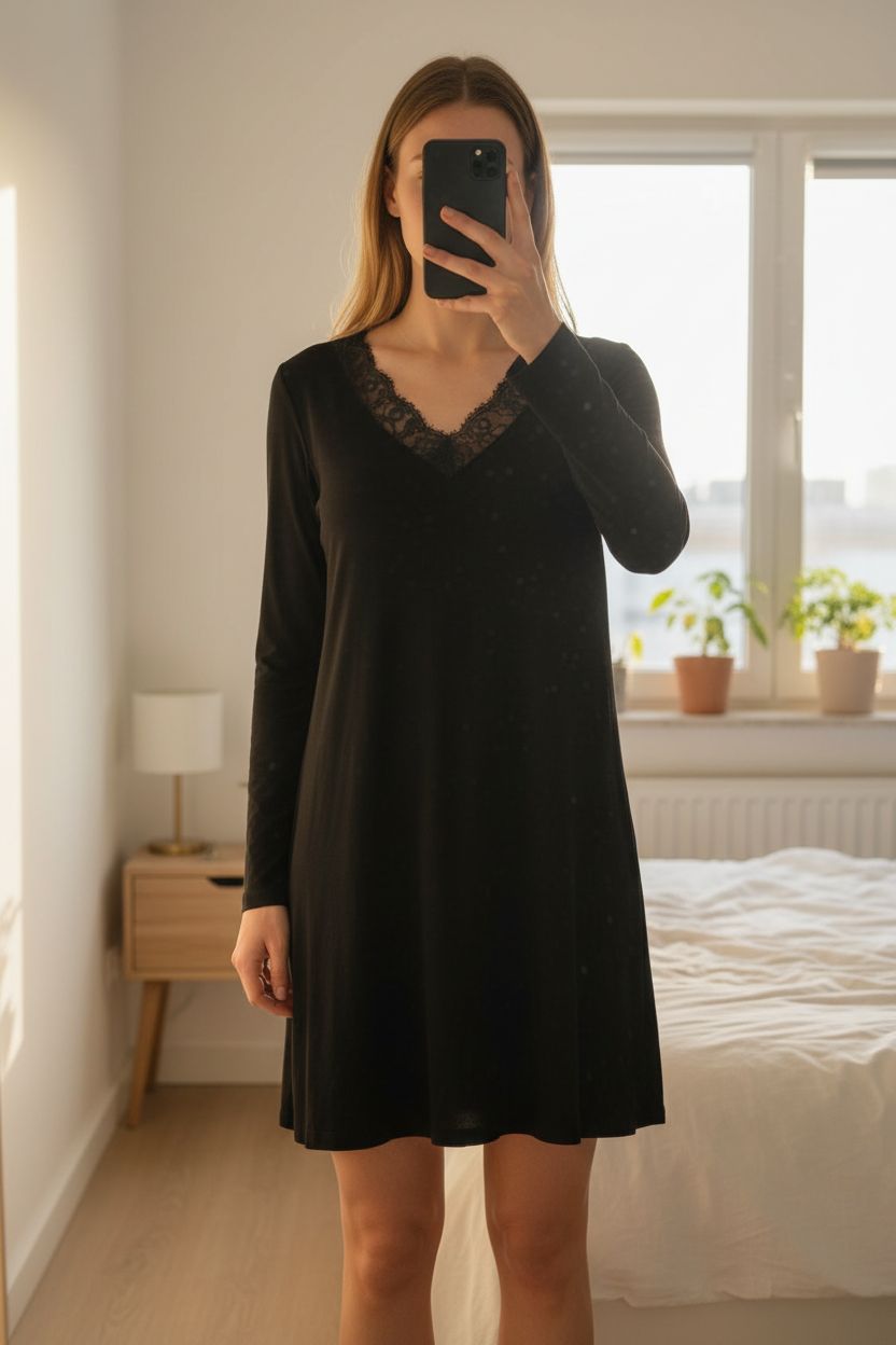 Jolie nuisette Oysho debout, face à la caméra, dans une chambre à la lumière douce, avec une lumière naturelle filtrant par la fenêtre.