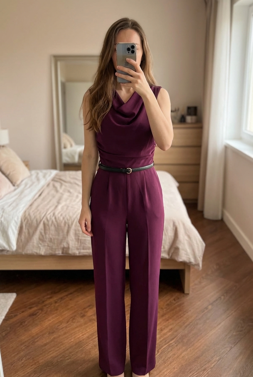Jumper bordeaux S with belt em pé, de frente para a câmera, em um quarto com iluminação suave e luz natural filtrando pela janela.