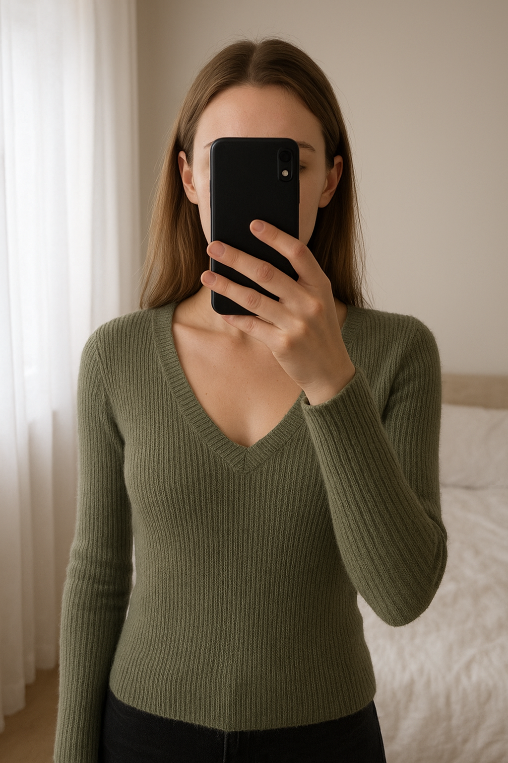 Jumper top standing straight facing the camera, in a softly lit bedroom setting, with gentle natural light filtering through a window.