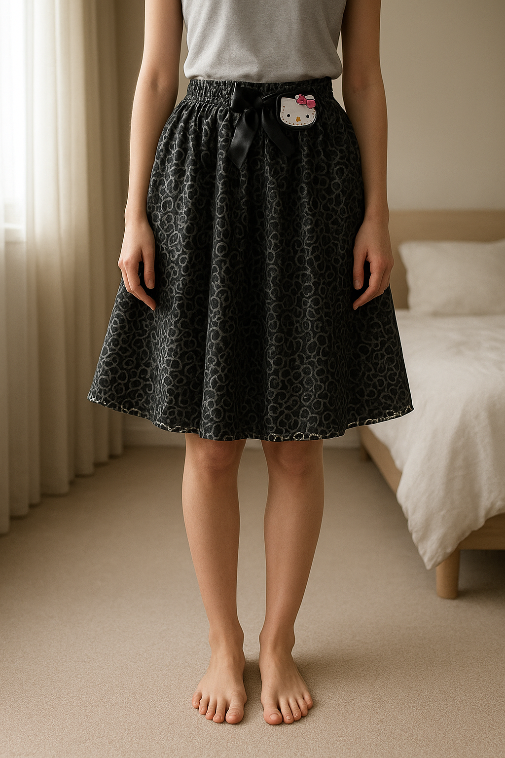 Jupe 4 ans debout, face à la caméra, dans une chambre à la lumière douce, avec une lumière naturelle filtrant par la fenêtre.