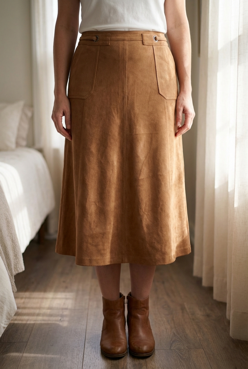Jupe aspect daim debout, face à la caméra, dans une chambre à la lumière douce, avec une lumière naturelle filtrant par la fenêtre.