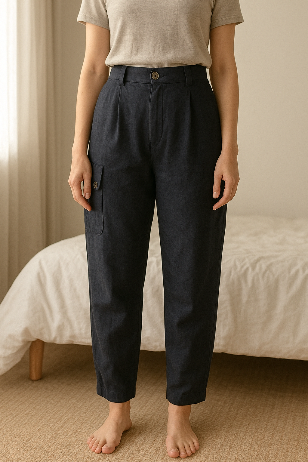 Jupe bouffant debout, face à la caméra, dans une chambre à la lumière douce, avec une lumière naturelle filtrant par la fenêtre.