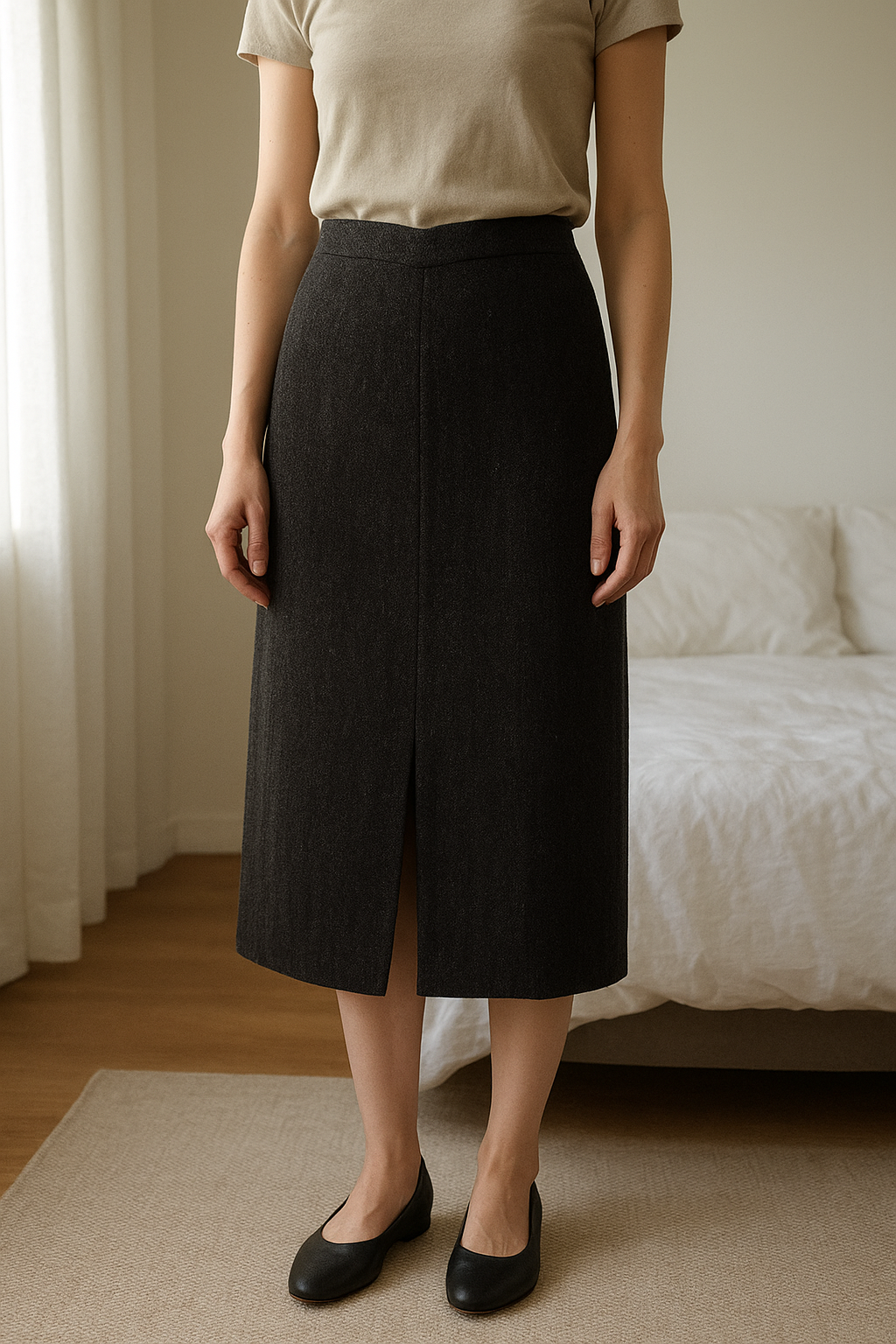 Jupe Crayon Taille Haute En Tweed Gris épais debout, face à la caméra, dans une chambre à la lumière douce, avec une lumière naturelle filtrant par la fenêtre.