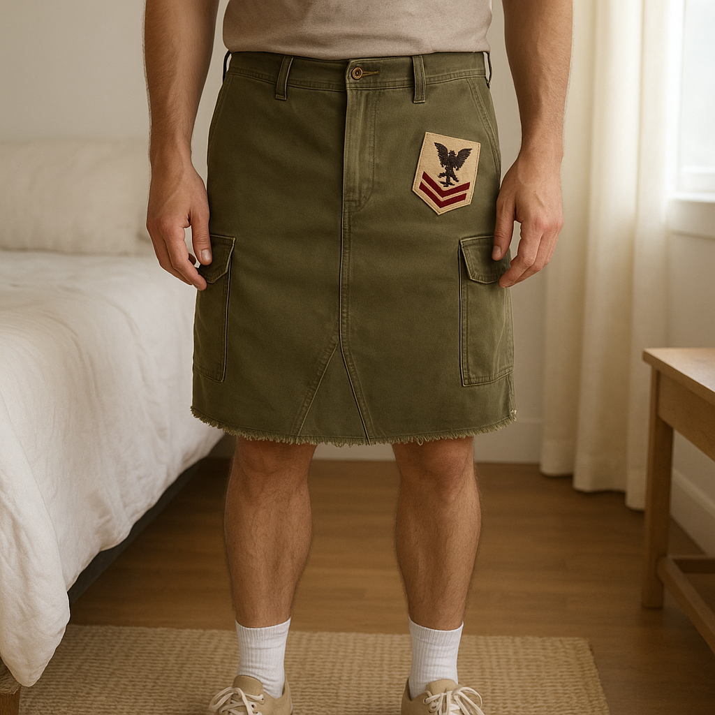 Jupe en jean style militaire #Morgan 36 debout, face à la caméra, dans une chambre à la lumière douce, avec une lumière naturelle filtrant par la fenêtre.