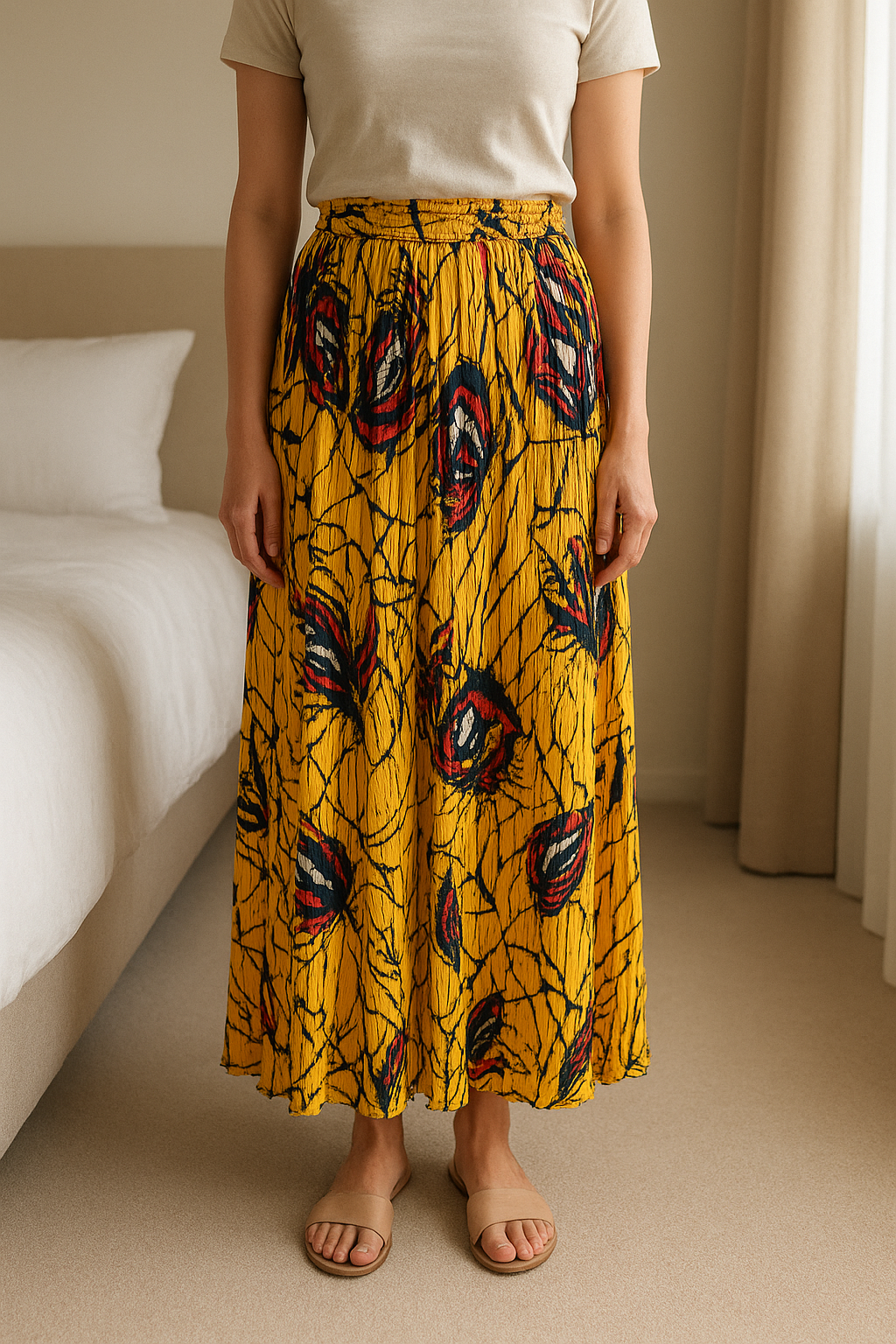 Jupe longue plissée – Ba&sh – Taille 34/36 – Modèle Wown debout, face à la caméra, dans une chambre à la lumière douce, avec une lumière naturelle filtrant par la fenêtre.