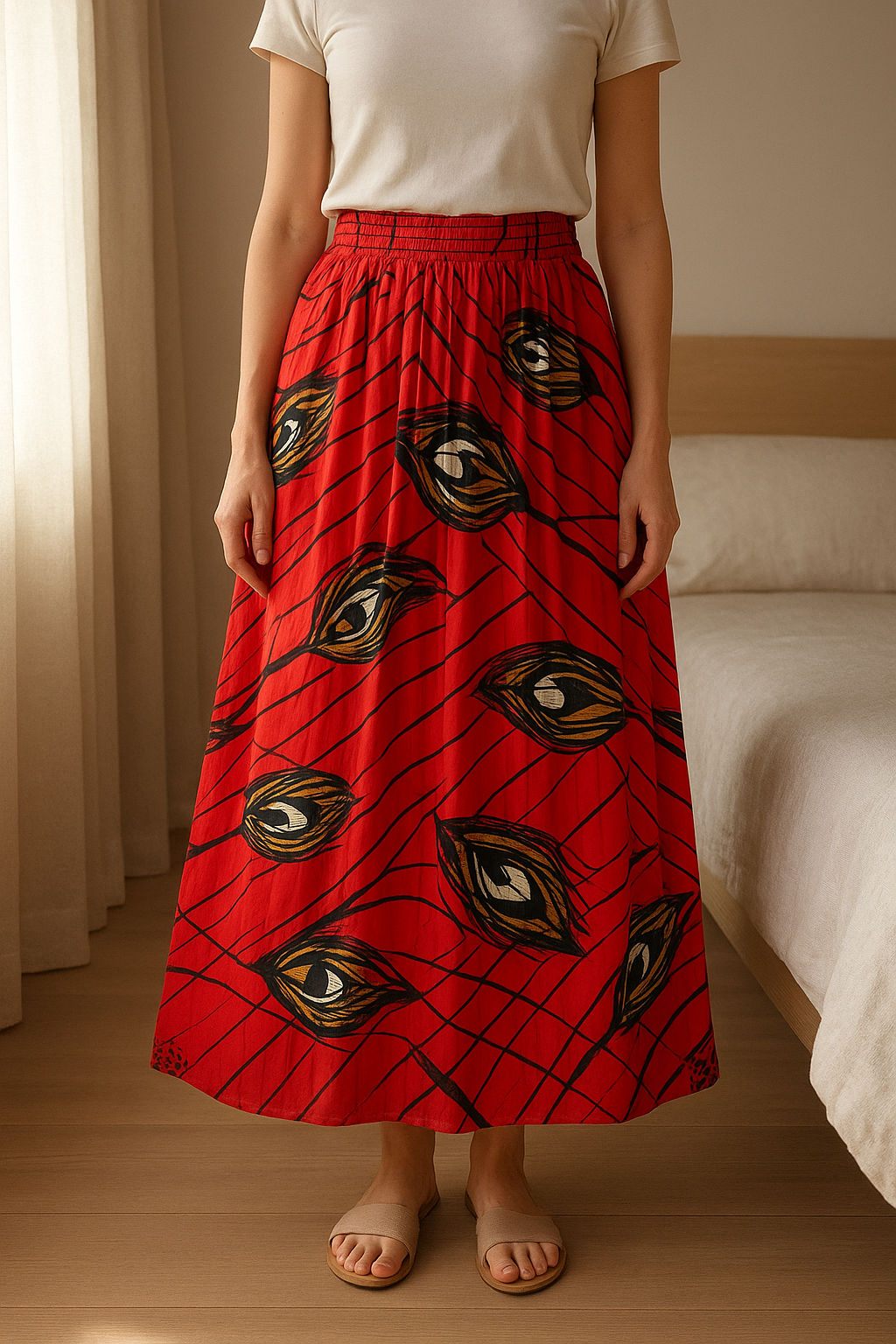 Jupe longue plissée très rare – Ba&sh – Modèle WOW – Taille 34 debout, face à la caméra, dans une chambre à la lumière douce, avec une lumière naturelle filtrant par la fenêtre.