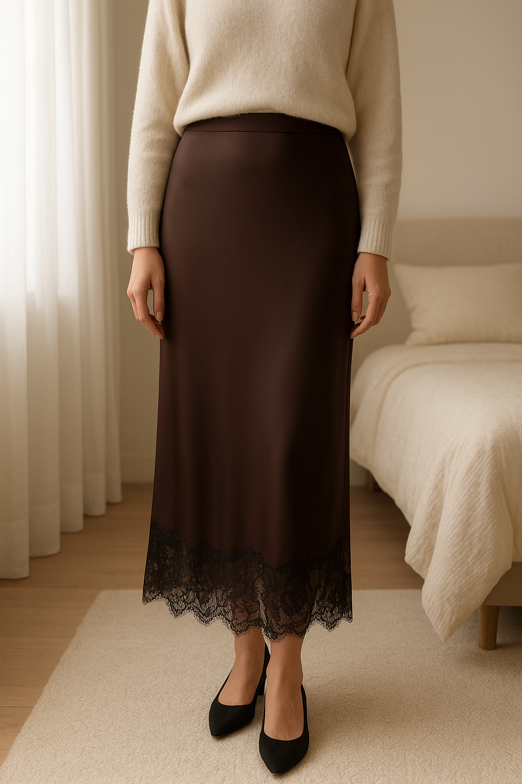 Jupe SARAH Satinée Italienne avec Dentelle – Confort & Élégance debout, face à la caméra, dans une chambre à la lumière douce, avec une lumière naturelle filtrant par la fenêtre.