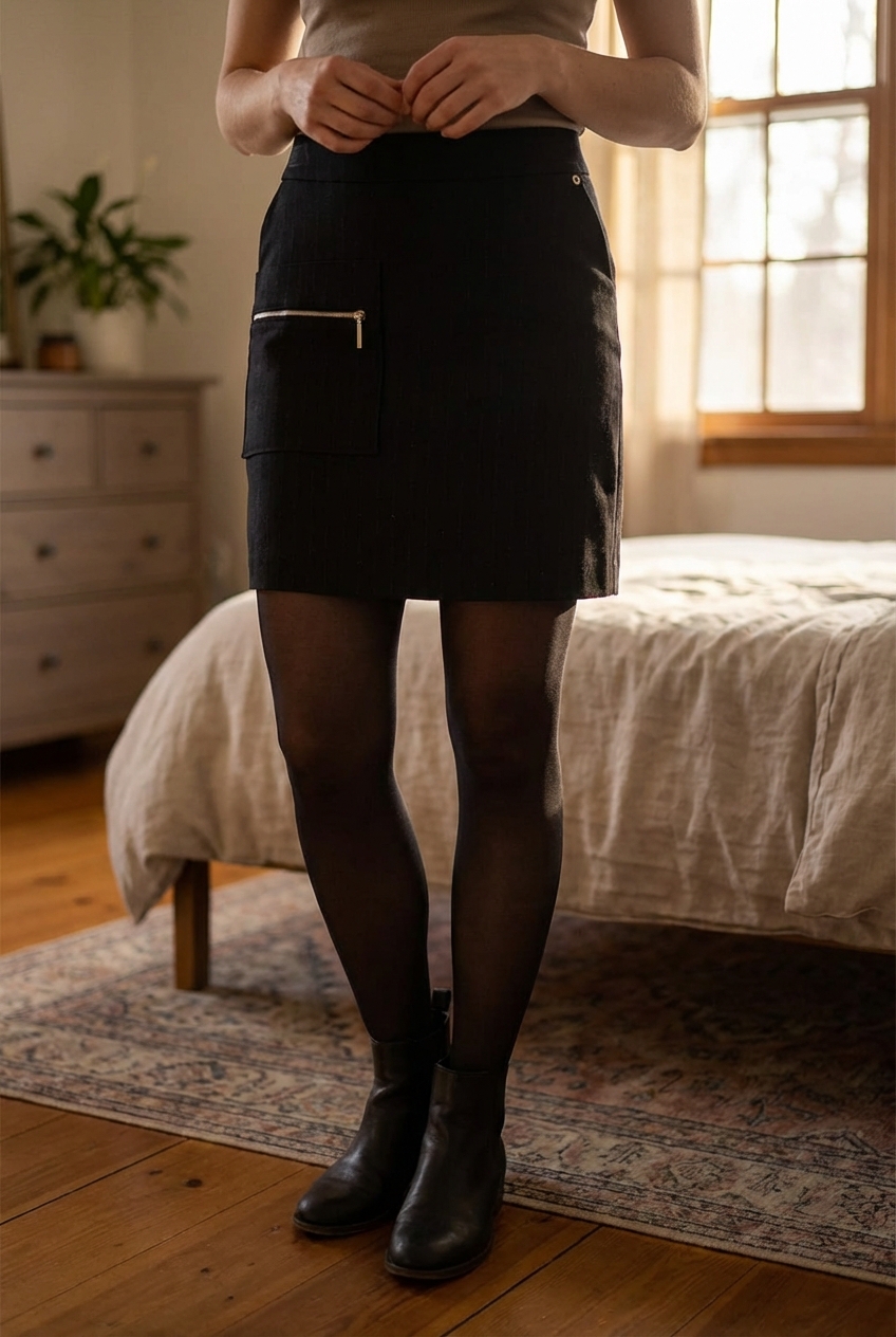 Jupe touraco debout, face à la caméra, dans une chambre à la lumière douce, avec une lumière naturelle filtrant par la fenêtre.