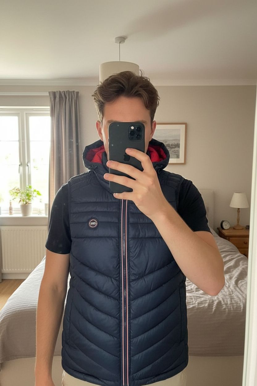 Kék Jack Jones mellény standing straight facing the camera, in a softly lit bedroom setting, with gentle natural light filtering through a window.