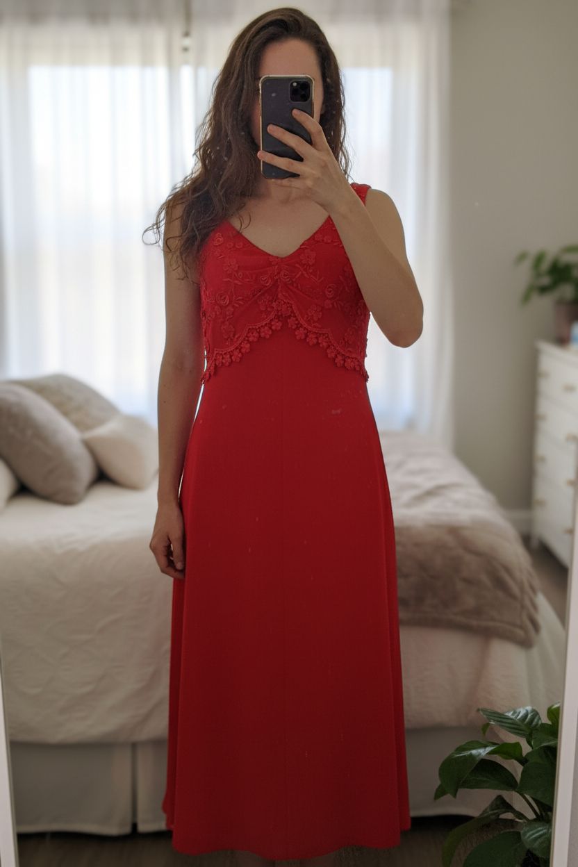 Karen Millen dress UK 12 red floral lace evening occasion party coquette glam baddie standing straight facing the camera, in a softly lit bedroom setting, with gentle natural light filtering through a window.