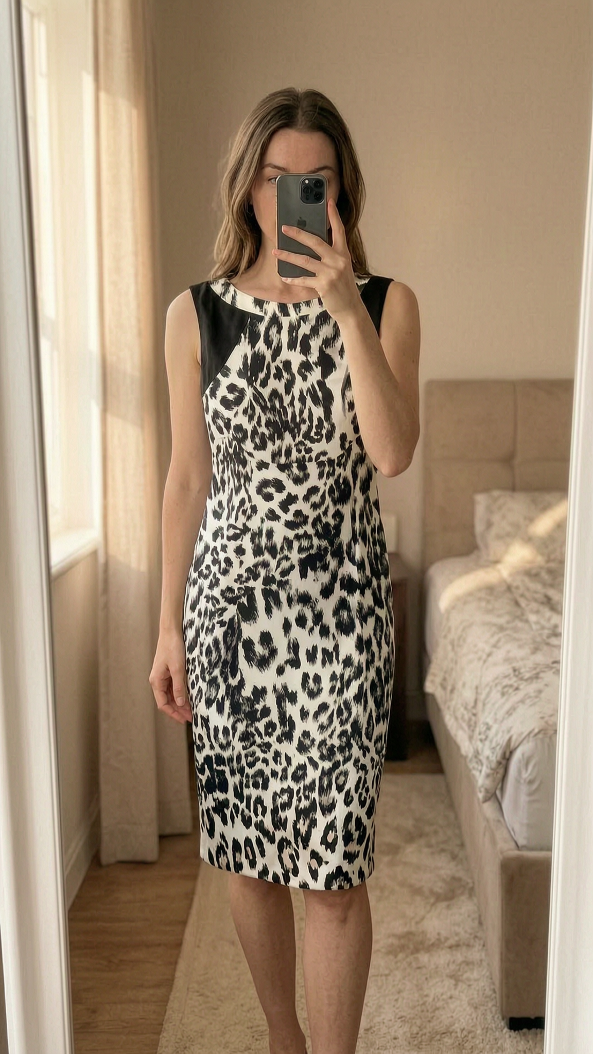 Karen Millen fitted dress uk12 standing straight facing the camera, in a softly lit bedroom setting, with gentle natural light filtering through a window.