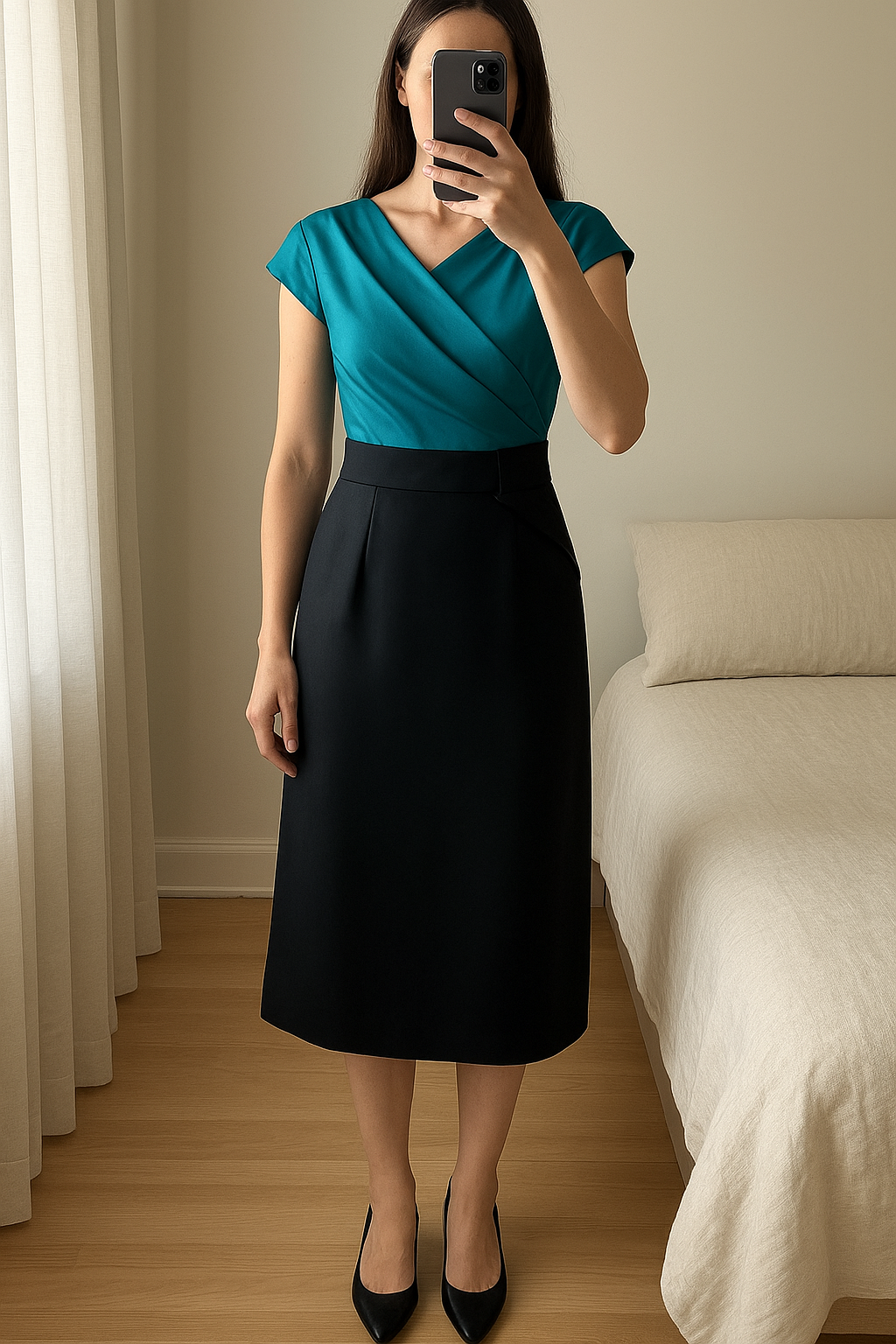 Karen Millen Turquoise Black Satin One Shoulder Occasion Party Dress - Size 8 standing straight facing the camera, in a softly lit bedroom setting, with gentle natural light filtering through a window.