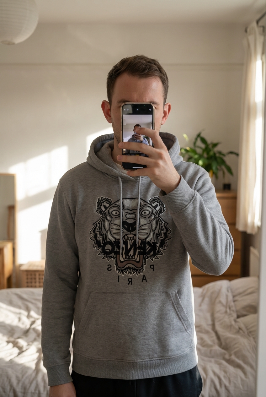 Kenzo Men’s Tiger Head Hoodie Gray standing straight facing the camera, in a softly lit bedroom setting, with gentle natural light filtering through a window.
