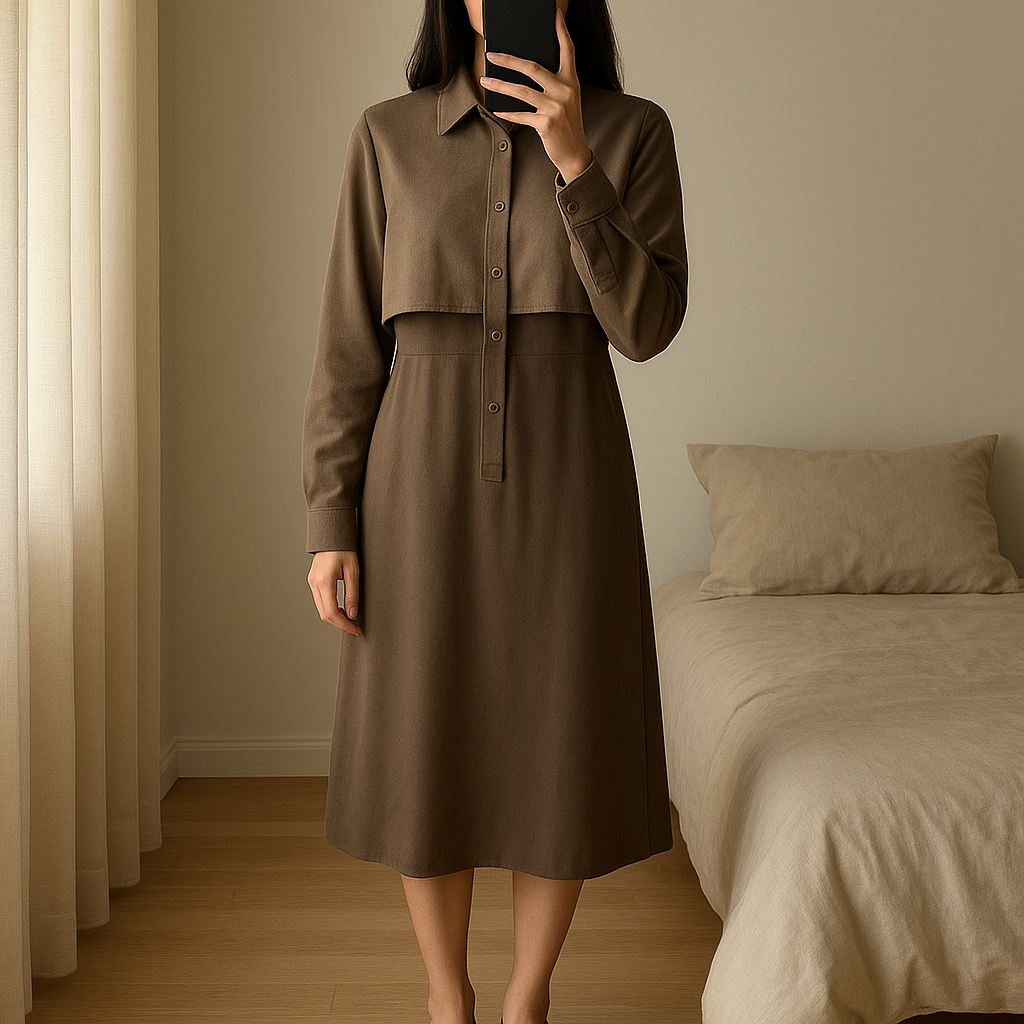 Khaki ruha standing straight facing the camera, in a softly lit bedroom setting, with gentle natural light filtering through a window.