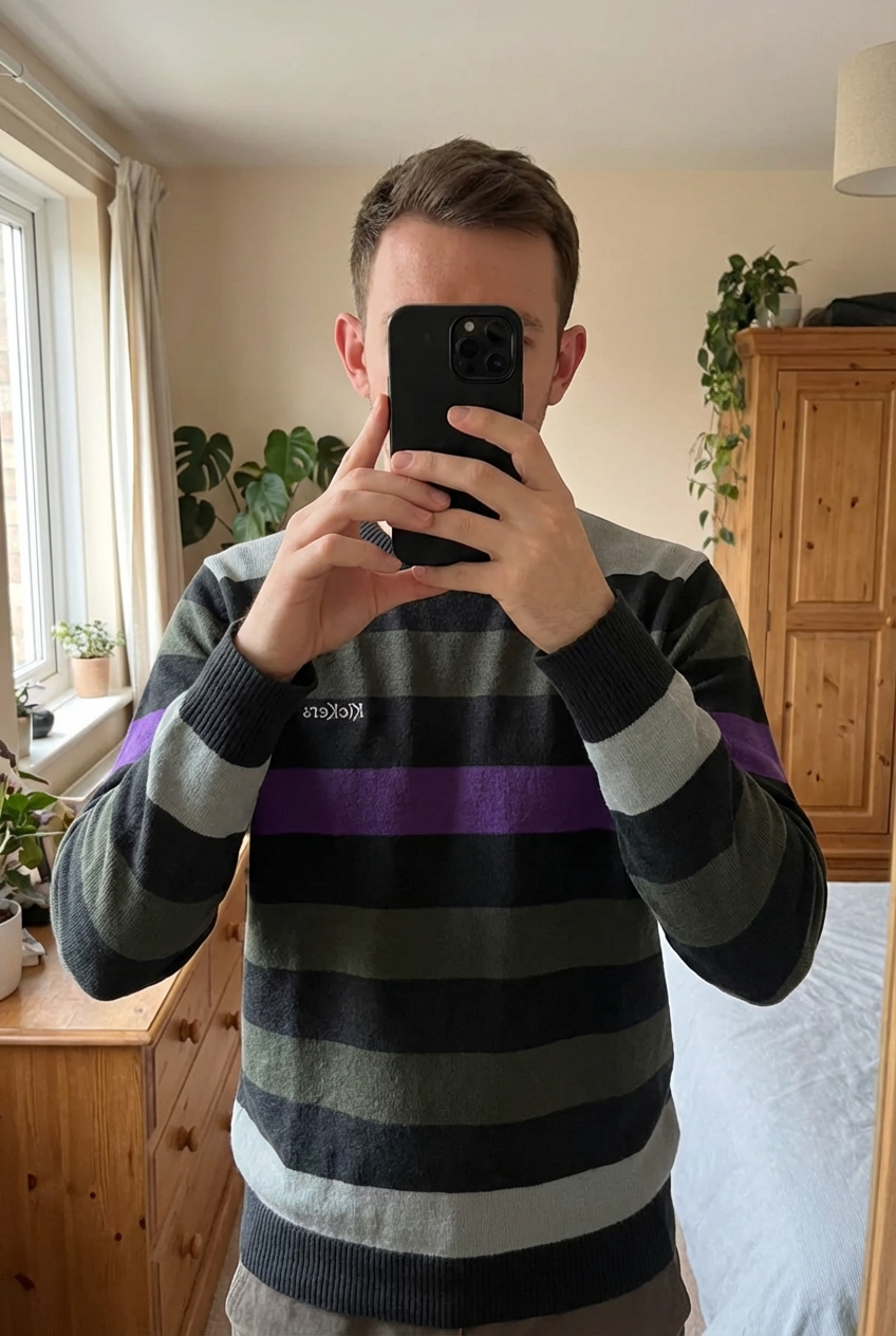 Kickers Mens Vintage Striped Cotton Knit Jumper Black, Grey, Khaki, Purple - Medium - VGC standing straight facing the camera, in a softly lit bedroom setting, with gentle natural light filtering through a window.