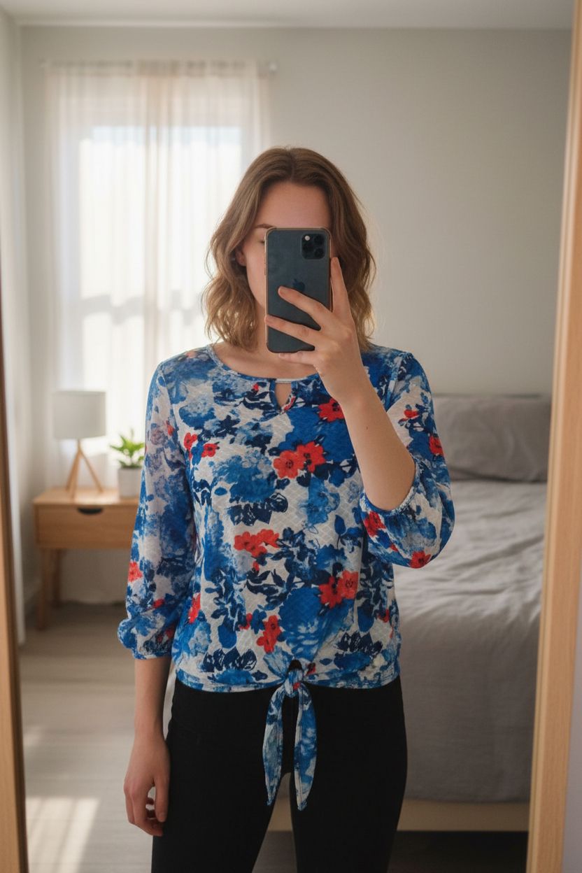 Klass blue & red top size L floral tie front blouse textured print soft stretch spring t shirt standing straight facing the camera, in a softly lit bedroom setting, with gentle natural light filtering through a window.