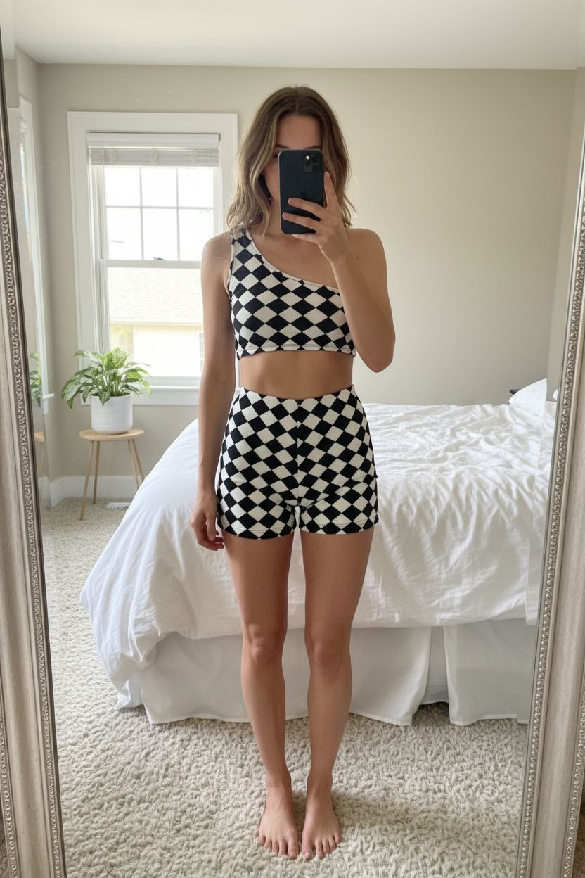 Kockás kezeslábas standing straight facing the camera, in a softly lit bedroom setting, with gentle natural light filtering through a window.