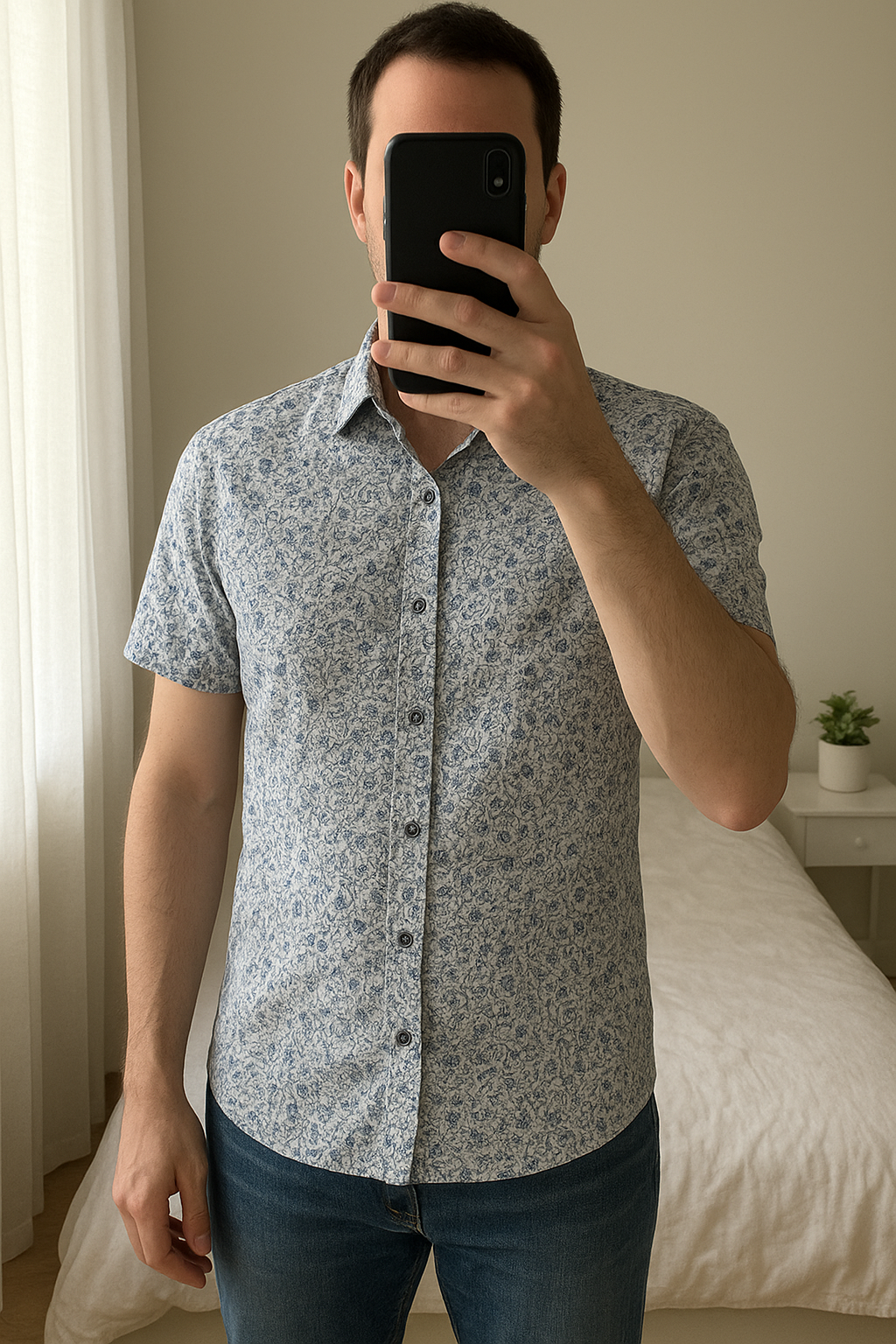 Koszula męska Redpolo Slim Fit w kwiaty niebiesko-biała standing straight facing the camera, in a softly lit bedroom setting, with gentle natural light filtering through a window.
