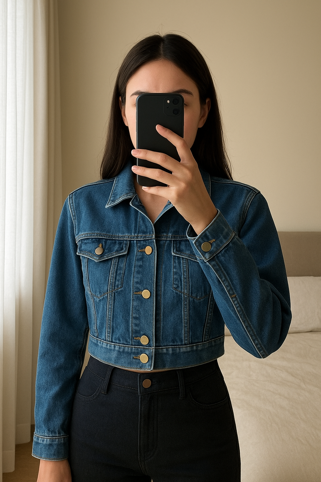 Kurtka dżinsowa jeansowa katana vintage lata 80 nadruk na plecach print standing straight facing the camera, in a softly lit bedroom setting, with gentle natural light filtering through a window.