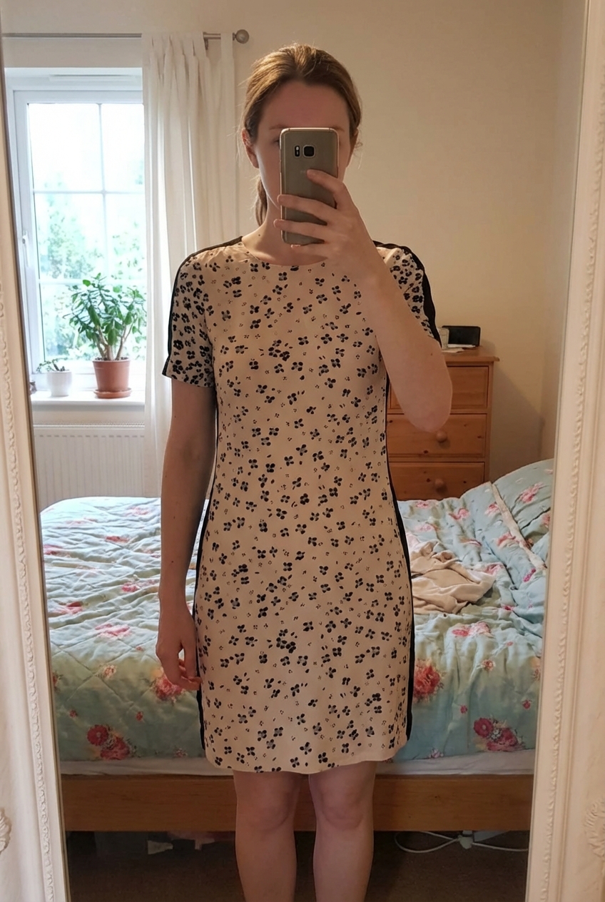 L.K.Bennett silk dress DR Blossom Ballerina UK 14 standing straight facing the camera, in a softly lit bedroom setting, with gentle natural light filtering through a window.