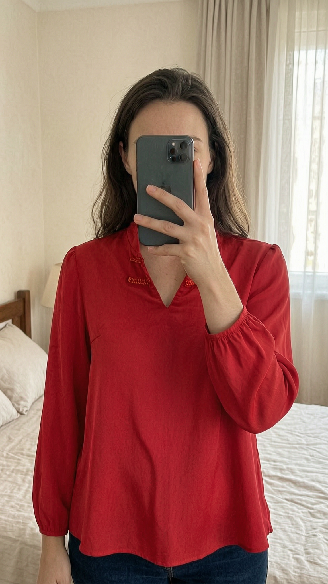 Ladies long sleeve blouse standing straight facing the camera, in a softly lit bedroom setting, with gentle natural light filtering through a window.