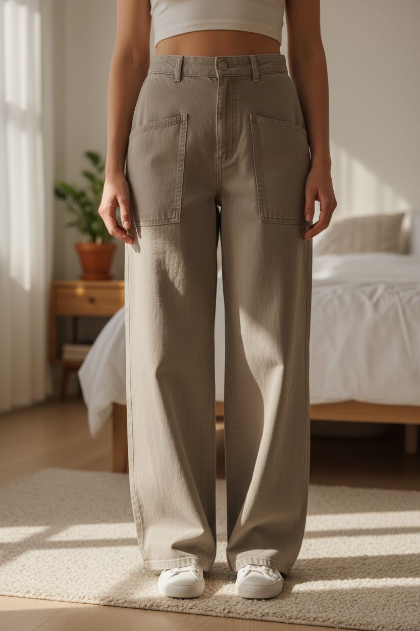 Ladies wide leg trousers standing straight facing the camera, in a softly lit bedroom setting, with gentle natural light filtering through a window.