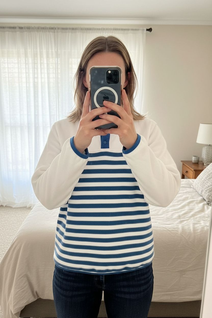 Lands End Striped Sweatshirt size M Blue White Breton Pullover Jumper standing straight facing the camera, in a softly lit bedroom setting, with gentle natural light filtering through a window.
