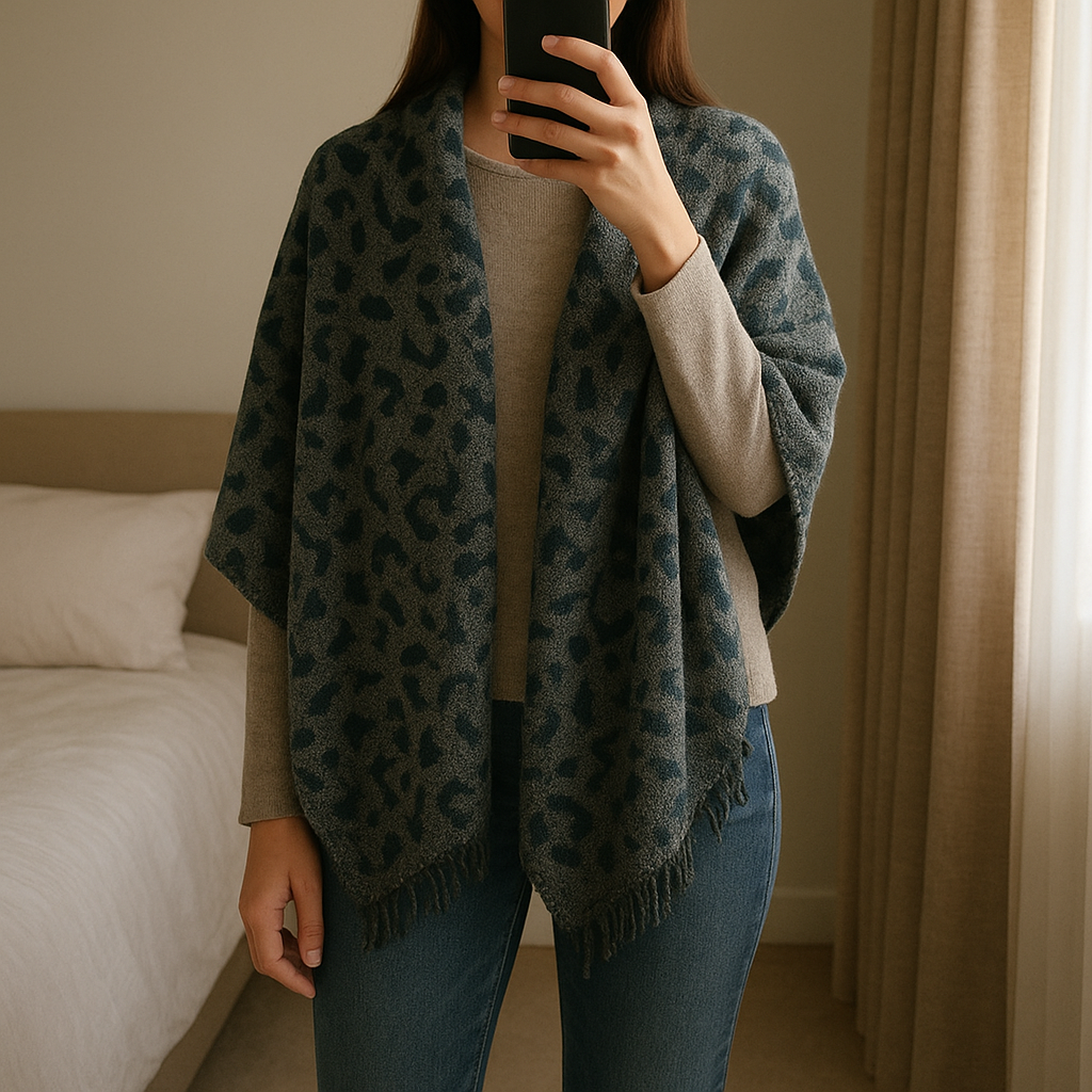 Large scarf. standing straight facing the camera, in a softly lit bedroom setting, with gentle natural light filtering through a window.