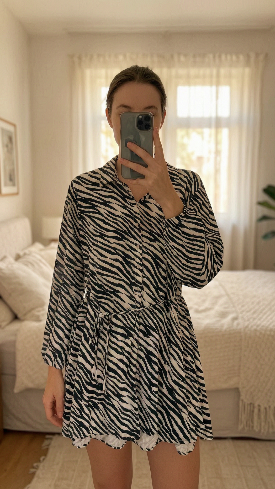 Lefties stylish black and white zebra print tie waist shirt dress - size 18 standing straight facing the camera, in a softly lit bedroom setting, with gentle natural light filtering through a window.