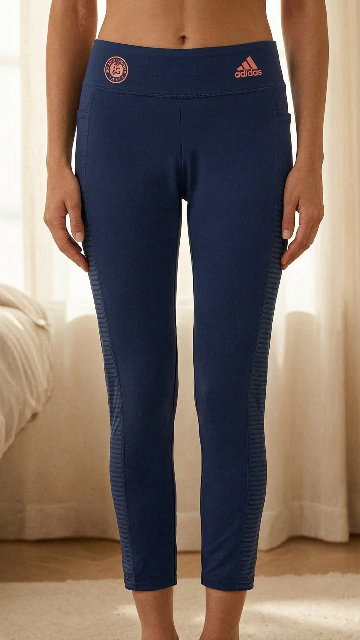 Legging Adidas Roland Garros année 2018 bleu ClimaCool taille M sport tennis debout, face à la caméra, dans une chambre à la lumière douce, avec une lumière naturelle filtrant par la fenêtre.