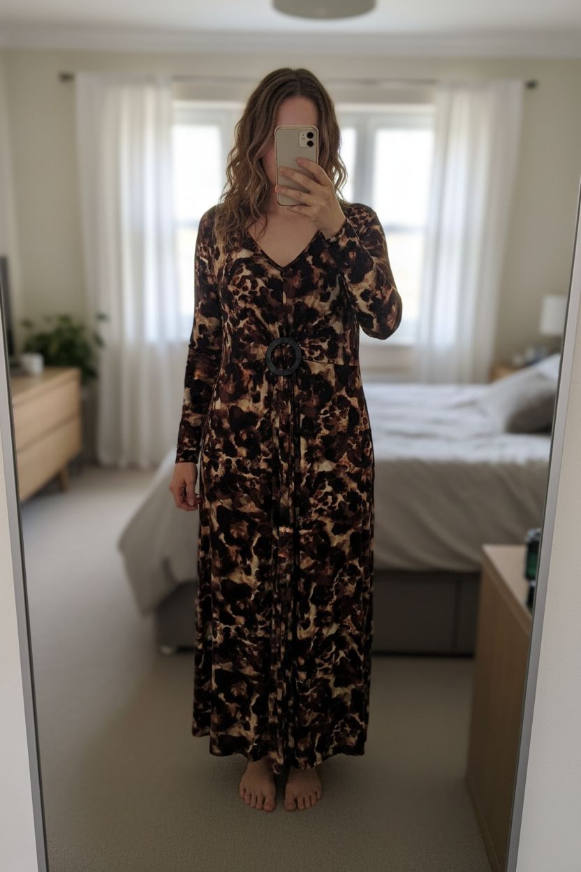 Leopard Print Midi Dress – Long Sleeve – Buckle Waist – Size 16 standing straight facing the camera, in a softly lit bedroom setting, with gentle natural light filtering through a window.