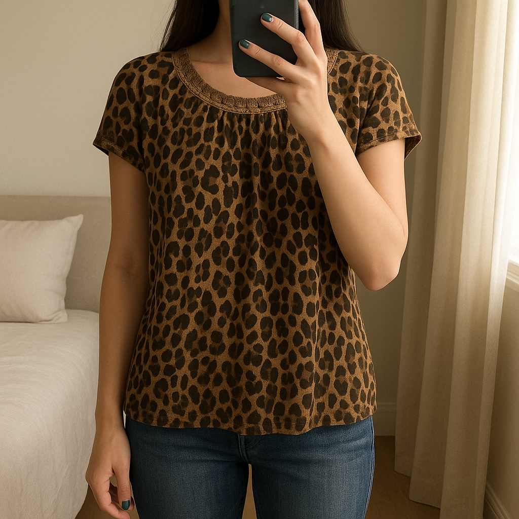 Leopard Print Top - Next Petite standing straight facing the camera, in a softly lit bedroom setting, with gentle natural light filtering through a window.