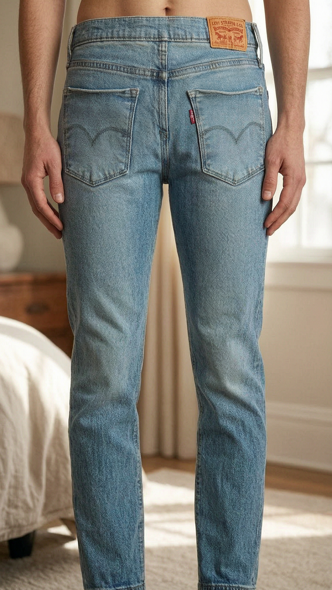 Levi Jeans standing straight facing the camera, in a softly lit bedroom setting, with gentle natural light filtering through a window.