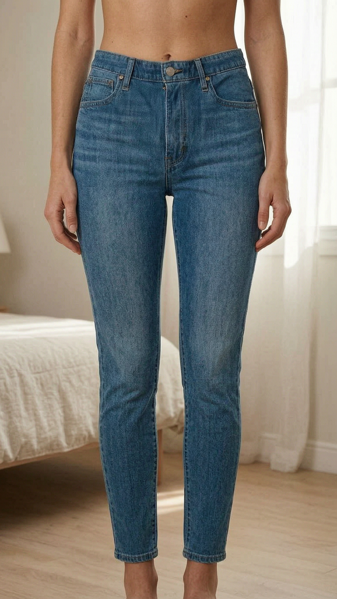 Levi’s 721 high rise skinny jeans 29, 32 standing straight facing the camera, in a softly lit bedroom setting, with gentle natural light filtering through a window.