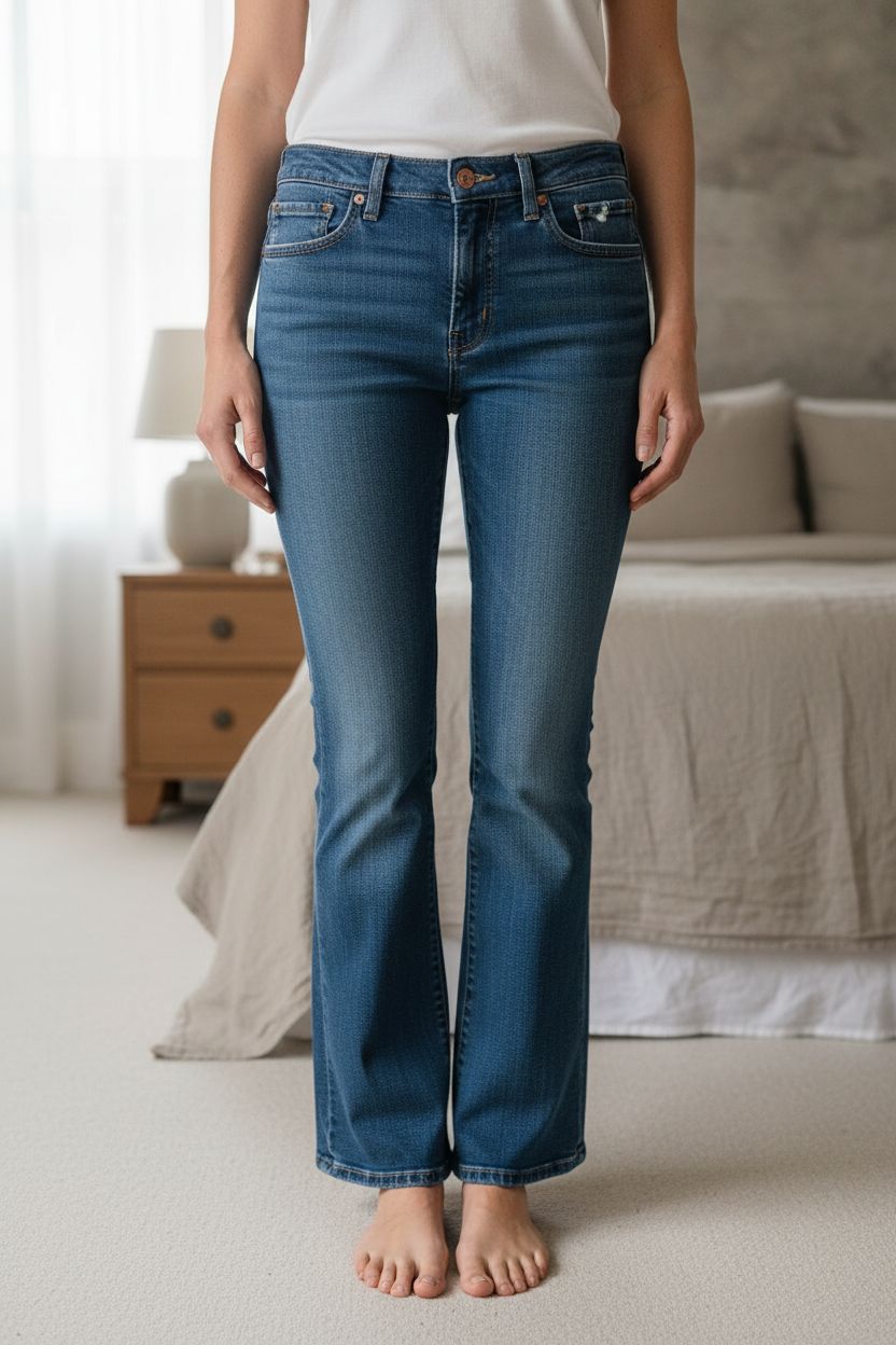 Levi’s boot cut jeans standing straight facing the camera, in a softly lit bedroom setting, with gentle natural light filtering through a window.
