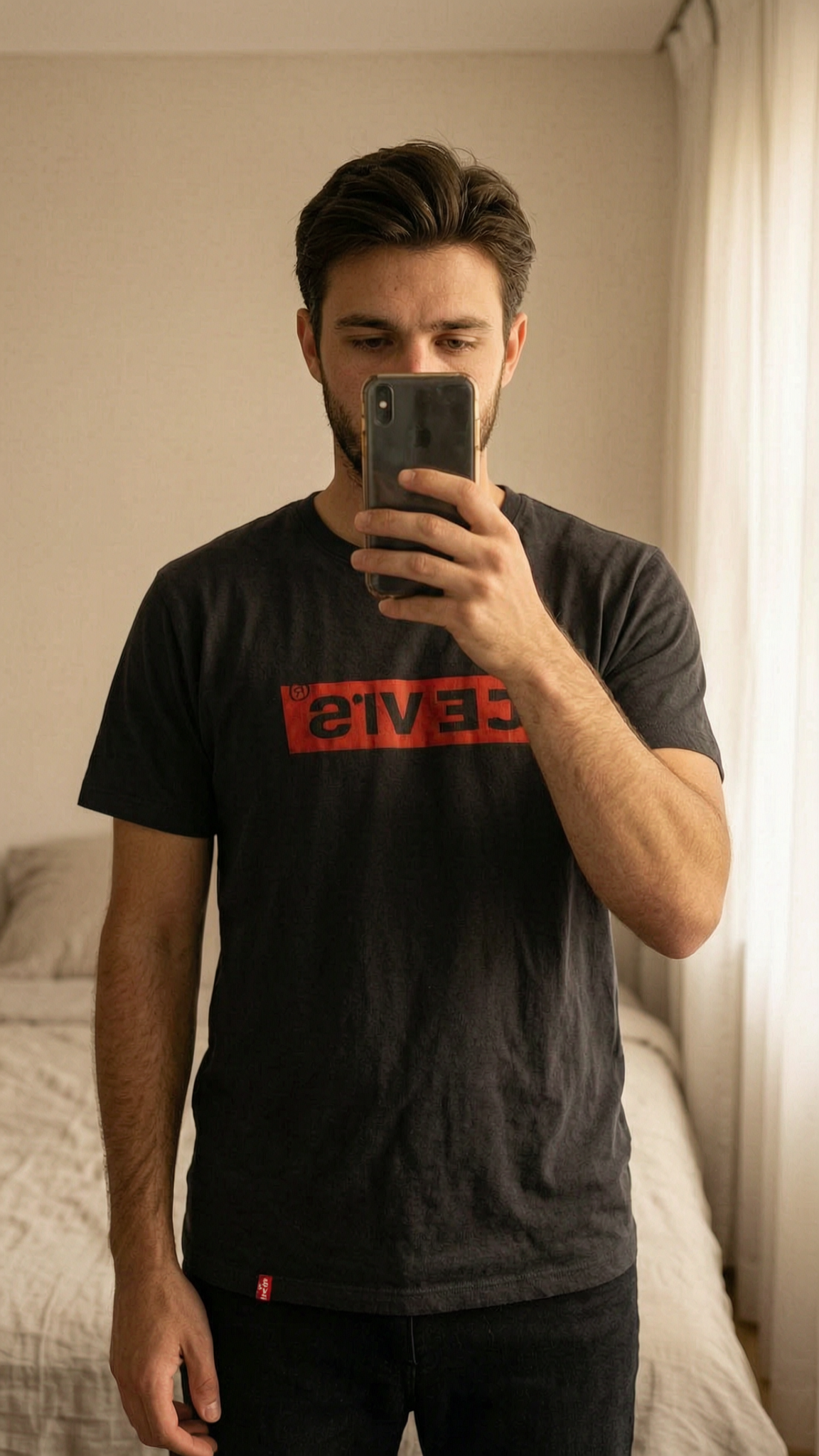 A person in Levi’s - T Shirt - Black - M standing straight facing the camera, in a softly lit bedroom setting, with gentle natural light filtering through a window.