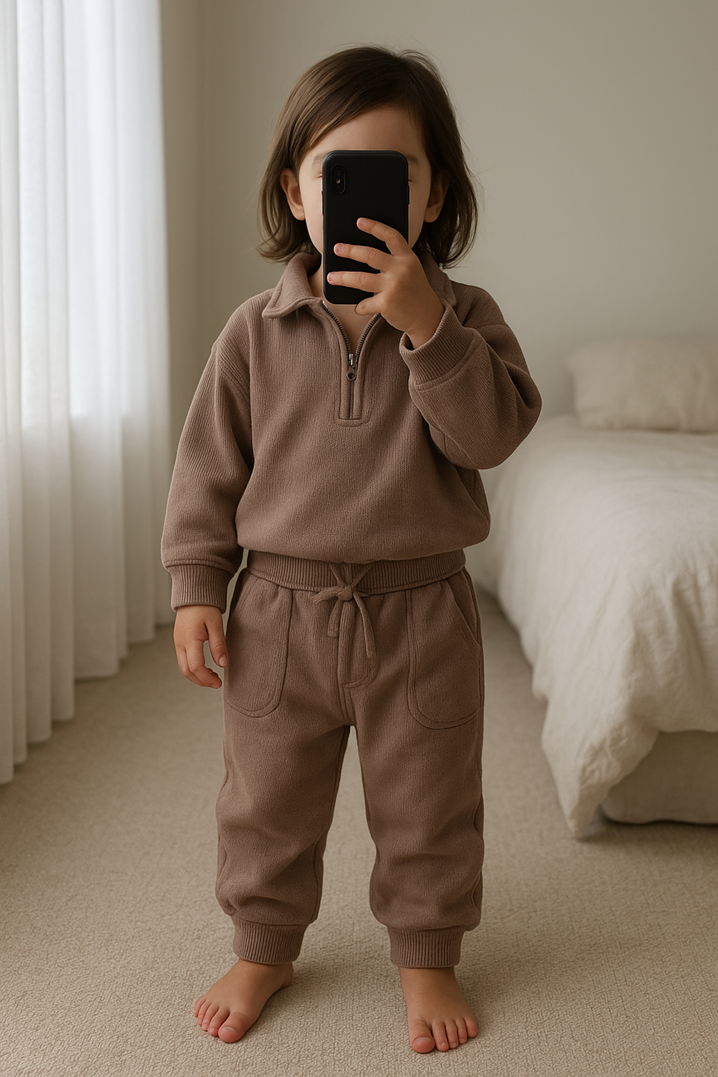 Light brown tracksuit standing straight facing the camera, in a softly lit bedroom setting, with gentle natural light filtering through a window.