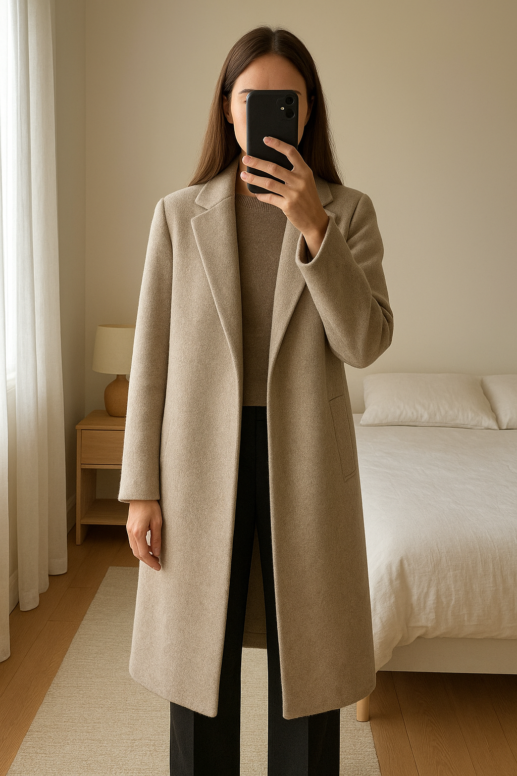 Lightweight overcoat, size Small standing straight facing the camera, in a softly lit bedroom setting, with gentle natural light filtering through a window.