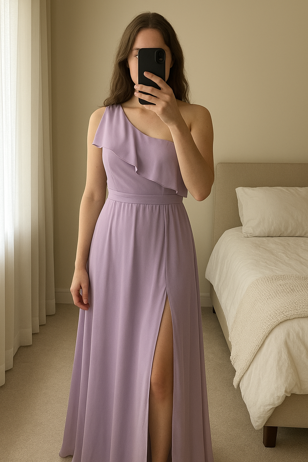 Lilac bridesmaid dress size 10 standing straight facing the camera, in a softly lit bedroom setting, with gentle natural light filtering through a window.