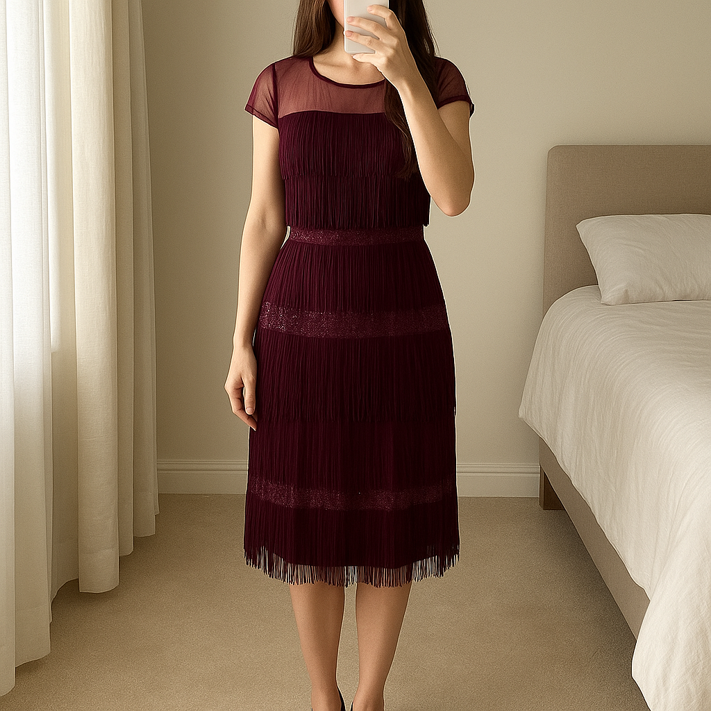 Lily & Franc Burgundy Sheer Shoulder Tassel Dress Occasion Dress Knee Length - size 10 standing straight facing the camera, in a softly lit bedroom setting, with gentle natural light filtering through a window.