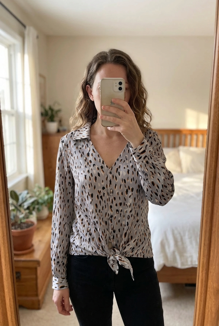 Linea silky feel v-neck collared blouse with knotted tie waist on-trend abstract print size 8 standing straight facing the camera, in a softly lit bedroom setting, with gentle natural light filtering through a window.