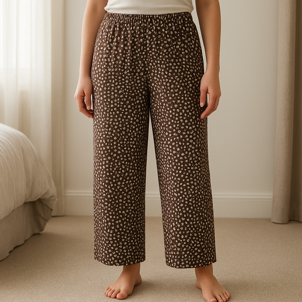 Linen trousers standing straight facing the camera, in a softly lit bedroom setting, with gentle natural light filtering through a window.