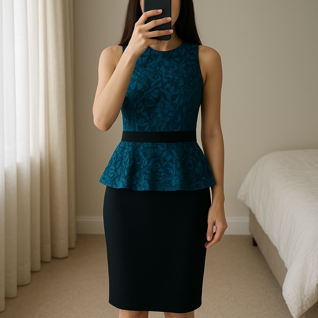 Lipsy X Michelle Keegan Teal Blue Lace Peplum Occasion Party Dress with Halter Neck - Size 8 standing straight facing the camera, in a softly lit bedroom setting, with gentle natural light filtering through a window.