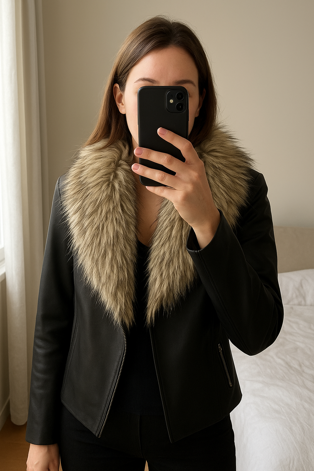 Lipsy y2k faux fur faux leather coat size 10 standing straight facing the camera, in a softly lit bedroom setting, with gentle natural light filtering through a window.