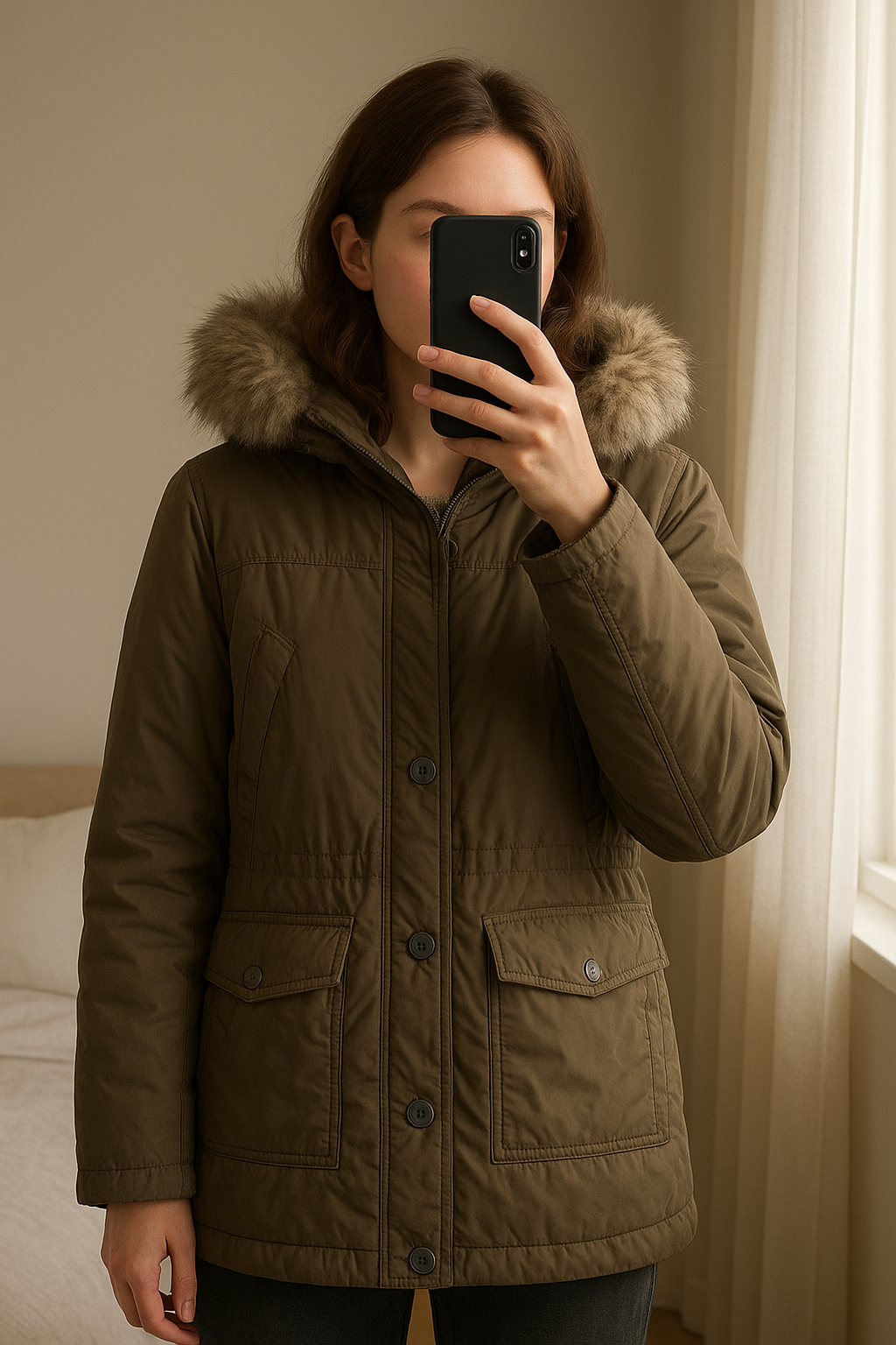 Long coat standing straight facing the camera, in a softly lit bedroom setting, with gentle natural light filtering through a window.